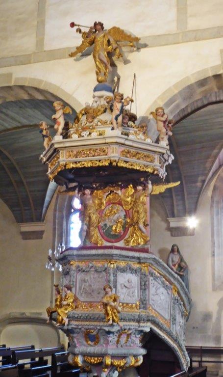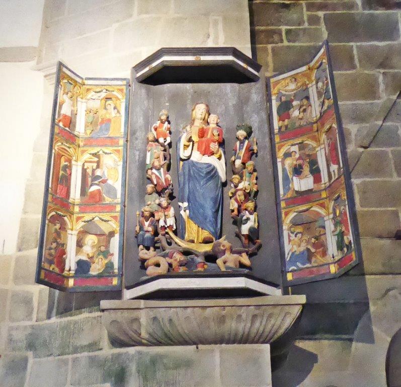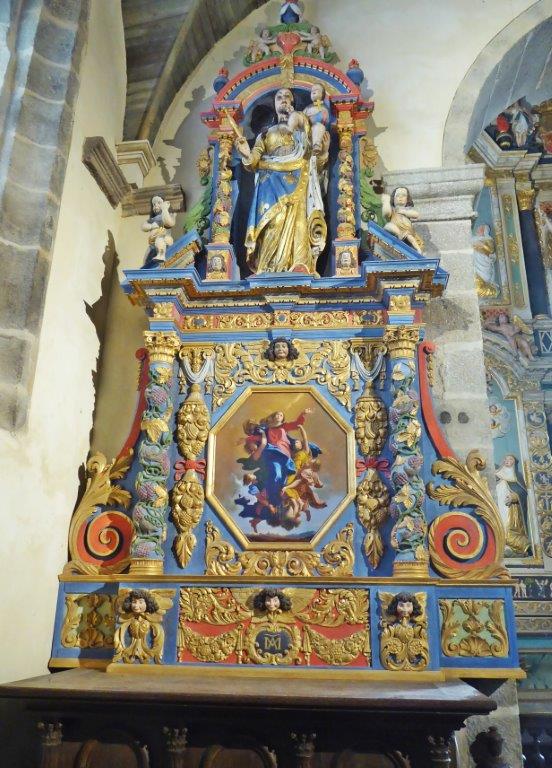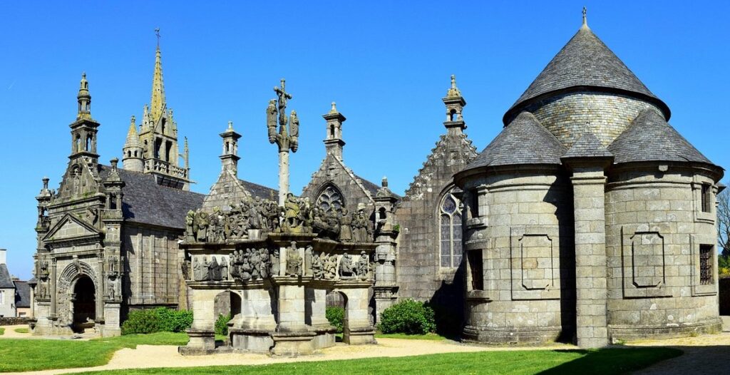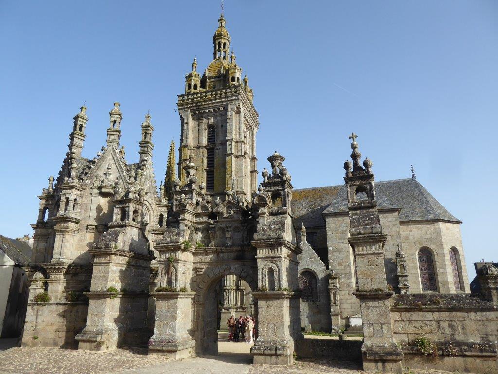 Les trésors d’architecture sont ici partout à portée du regard : la porte triomphale, le calvaire à triple croix avec ses personnages de la Passion du Christ sculptés dans la pierre de Kersanton, l’ossuaire aux dimensions impressionnantes, l’église au clocher gothique de 1563 et son intérieur richement décoré de retables, autels, chaire à prêcher de 1677.